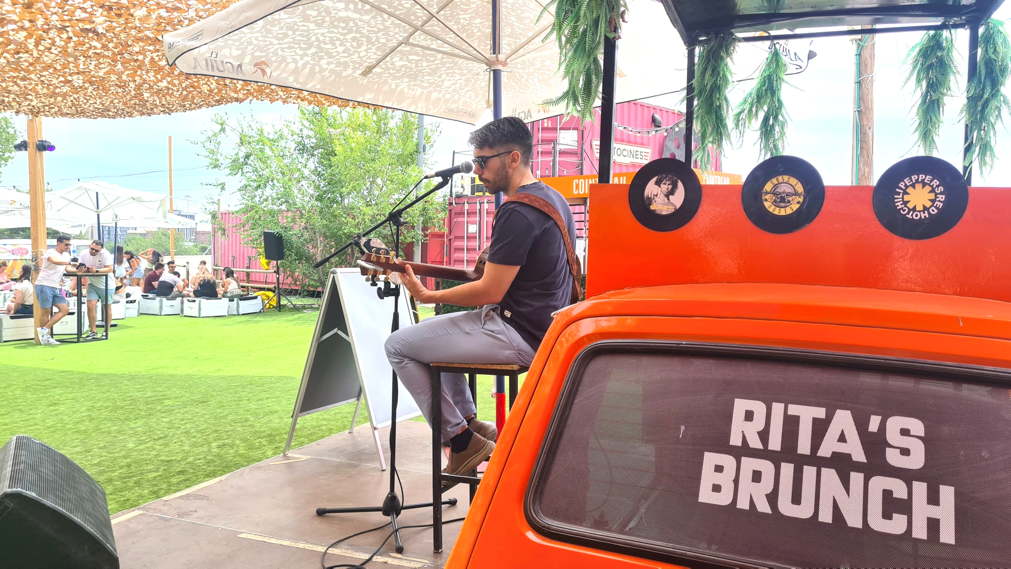 Porque en los primeros compases es turno de ocupar tu asiento, tranquilo que hay sombra para todos, y hacer uso de la barra libre de sangría y cerveza -si es que has comprado este tipo de entrada- que tendrás hasta las 3 de la tarde. Tranquilo, también hay acceso que incluyen una consumición que puede ser agua, refresco, zumo, etcétera... toca saludarse, entablar conversación, y hacerlo liberado de los niños, que estarán revoloteando por una amplia zona al aire libre -lleva gorra para ellos, aquí no hay sombra-, en ocasiones y días puntuales por cierto con monitor, mientras tú conversas con música en directo de fondo. Buen repertorio nos brindó Sergio Mares incluidos temas de cosecha propia. Una atmósfera que bien valdría ya la asistencia a Rita´s Brunch. Pero aún resta mucha tarde... y muchas sorpresas.